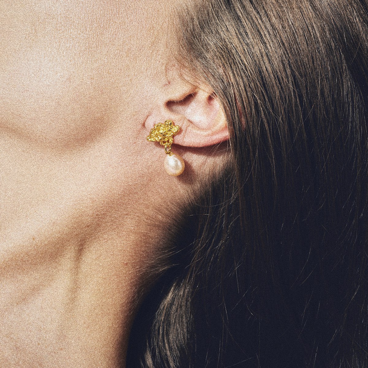 Hollow Cloud i forgyldt byder på en gylden, organisk sky med en lyserød regndråbe af ægte ferskvandsperle.