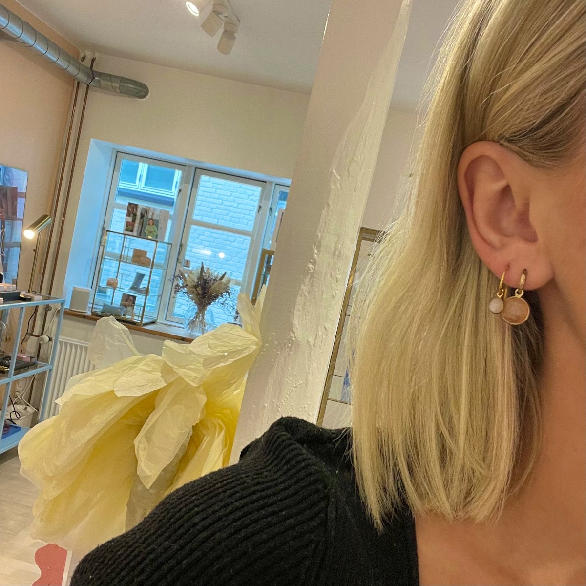 Øreringe fra Izabel Camille med små facetslebne runde vedhæng af ferskenfarvede månesten.