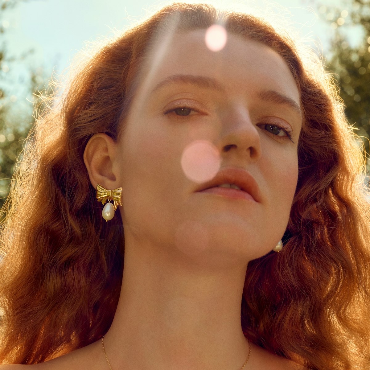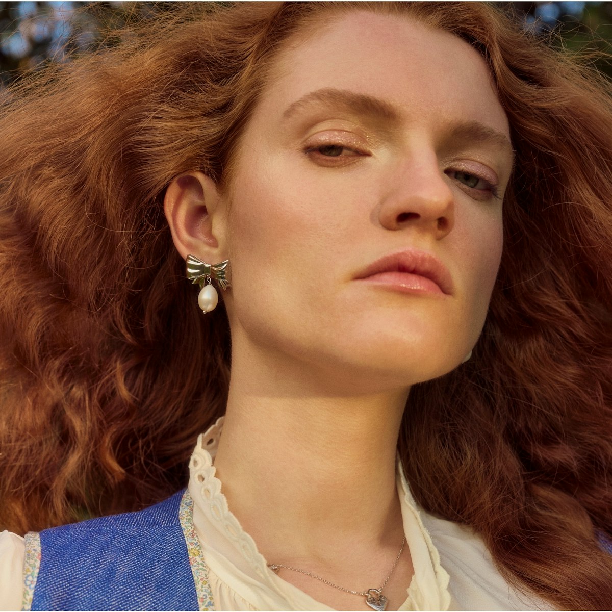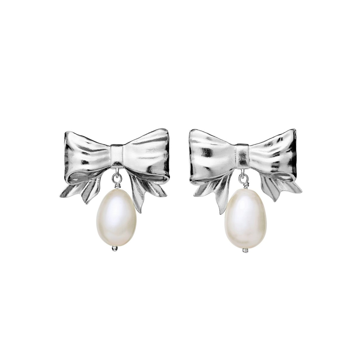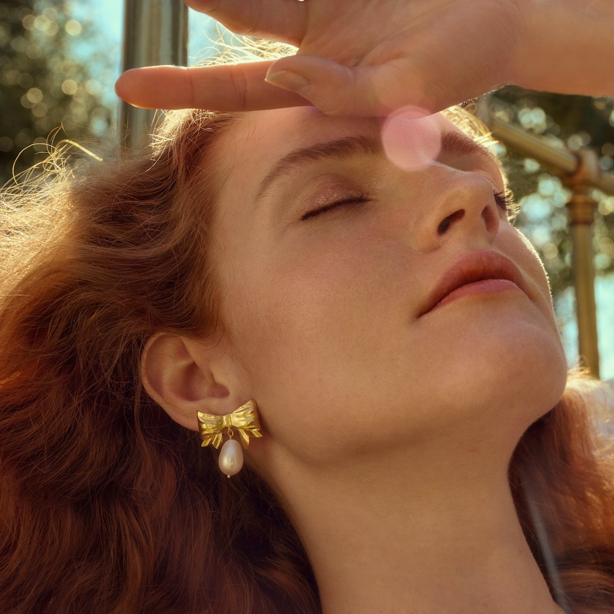 Diana øreringene er prydet med hvide ferskvandsperler, der elegant svajer under den gyldne sløjfes bånd. Ferskvandsperlerne tilføjer et strejf af klassisk skønhed til designet, mens deres naturlige glans fanger lyset og tilføjer en fin elegance.