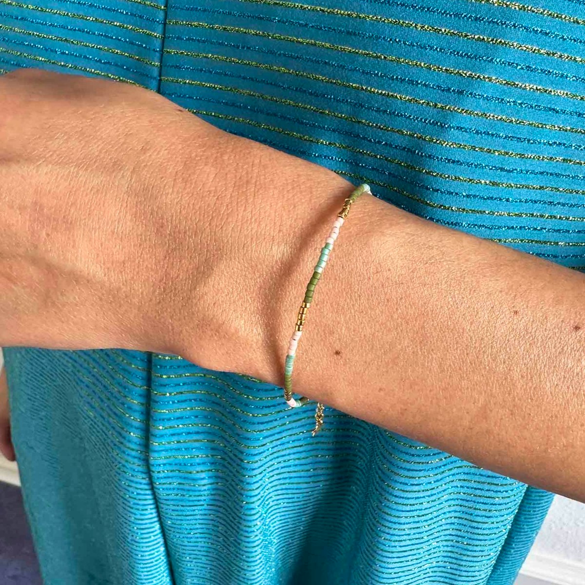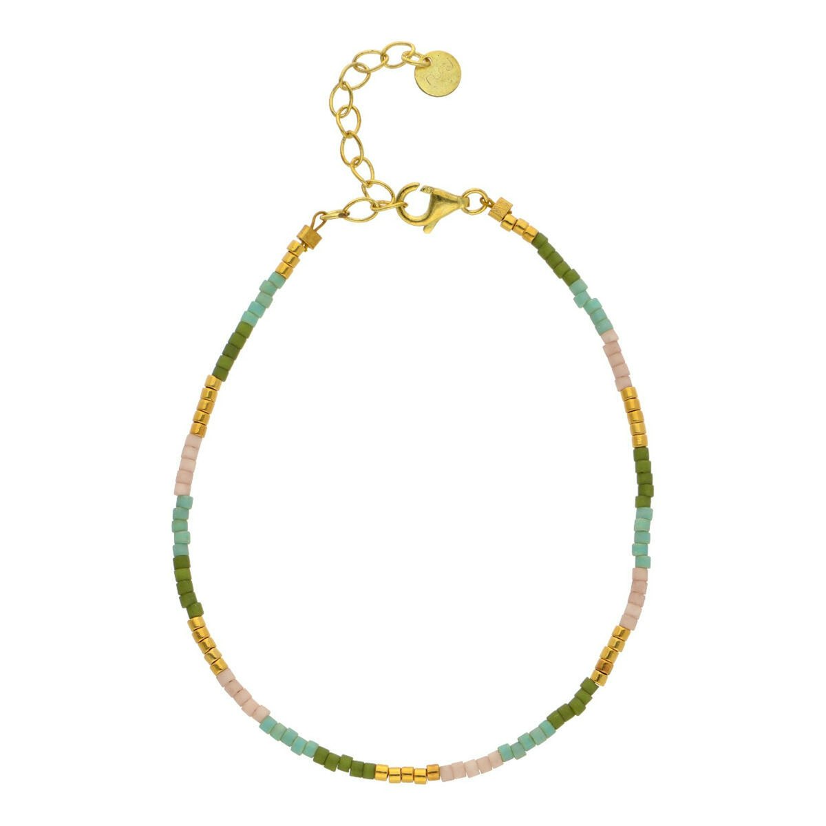 Kira Dusty Green Bracelet fra Nuni Copenhagen er et elegant, håndlavet perlearmbånd skabt i 24 karat forgyldt genanvendt sterlingsølv 925 og smukke glasperler i støvede grønne nuancer. Det delikate farvespil giver armbåndet et roligt, feminint udtryk, som både kan bæres alene eller kombineres med andre favoritter for et personligt look. Designet er let og raffineret – skabt til dig, der elsker farver med dybde og smykker med sjæl.