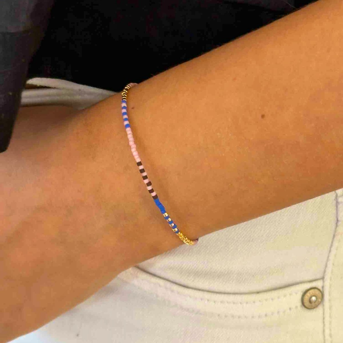 Nanna Blue Multi Bracelet fra Nuni Copenhagen er et håndlavet perlearmbånd skabt i 24 karat forgyldt genanvendt sterlingsølv 925 og farverige glasperler i smukke blå og multifarvede nuancer. Det livlige farvespil og det fine, lette design gør armbåndet til en perfekt detalje i ethvert outfit – uanset om du styler det alene eller i kombination med dine andre favoritter. Det er et smykke, der emmer af energi, leg og personlighed – præcis som du.