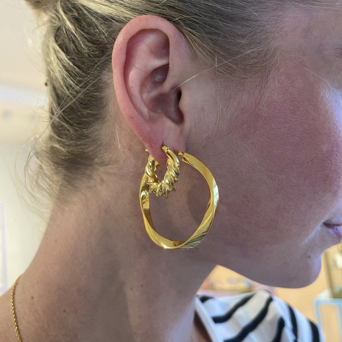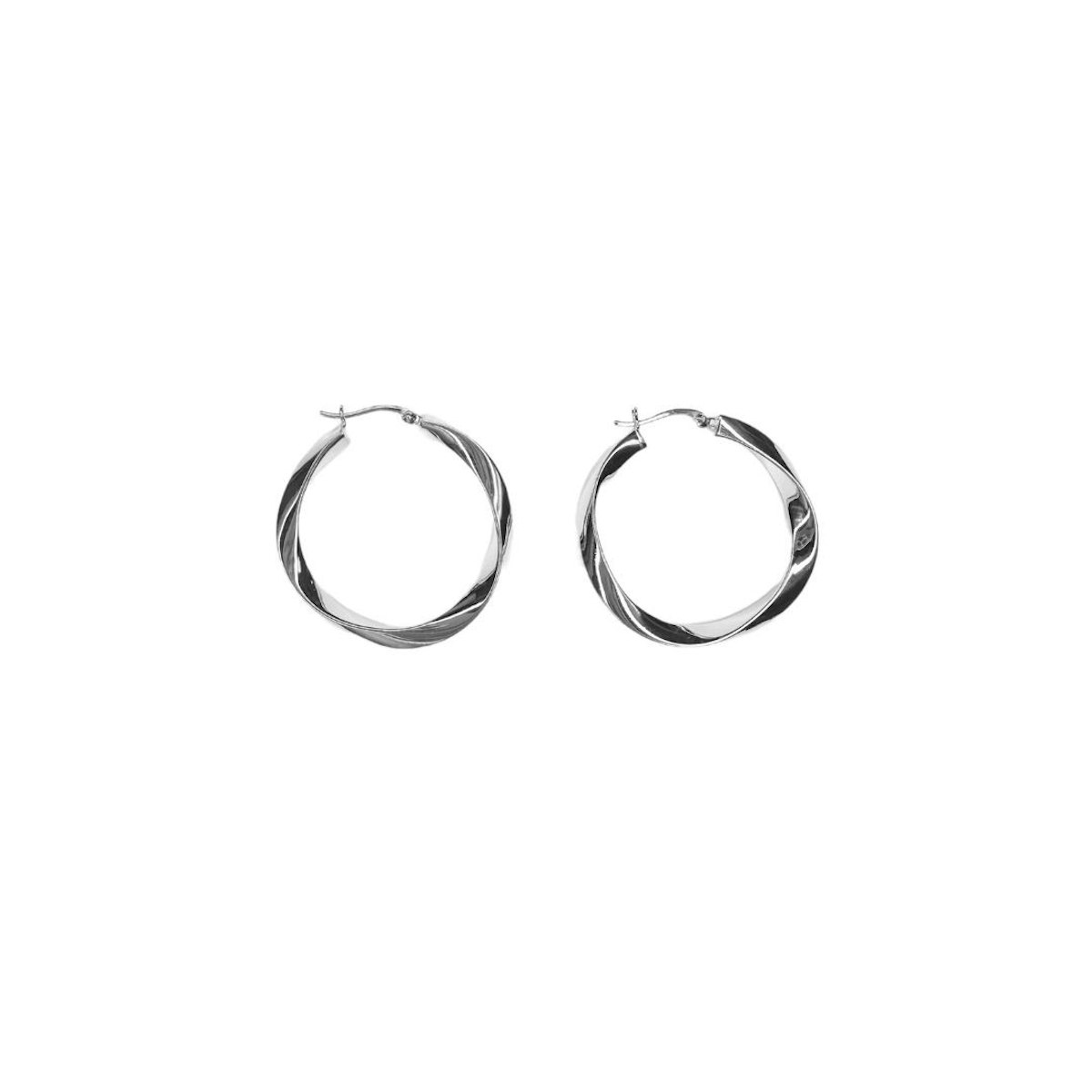 Denne slanke hoop med et diskret tvist forhøjer den klassiske stil med et strejf af stil. Det enkle, men karakteristiske design tilføjer et strejf af elegance og gør den til det ideelle tilbehør for dem, der værdsætter en moderne tolkning af tidløs elegance.