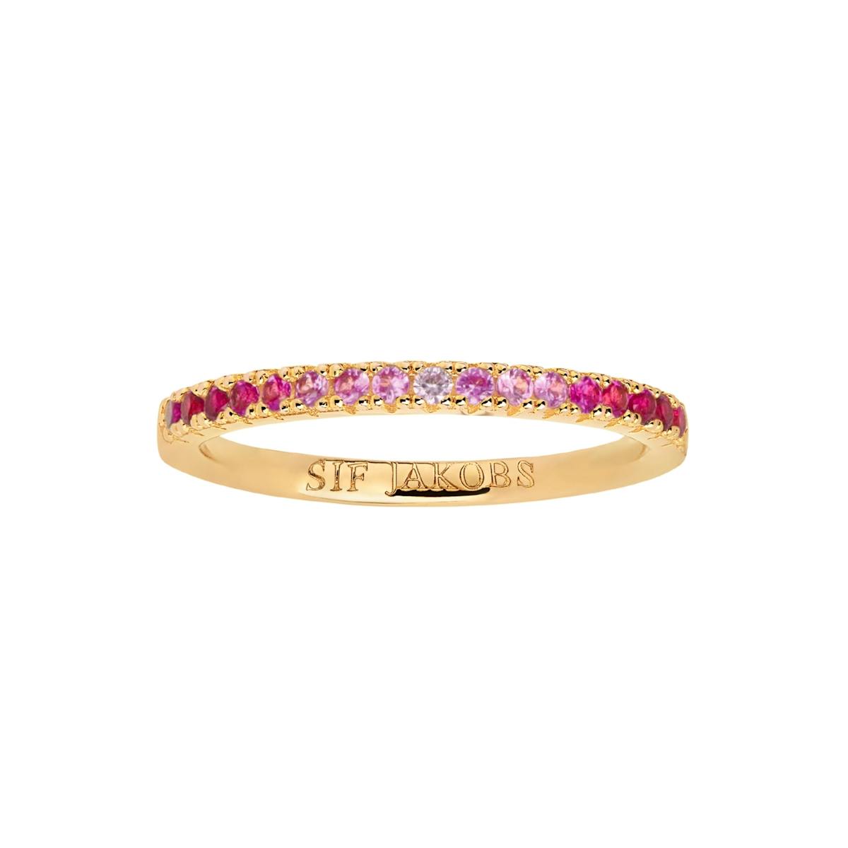 De ring is ook verkrijgbaar met veelkleurige, roze, groene en blauwe zirkonia's.