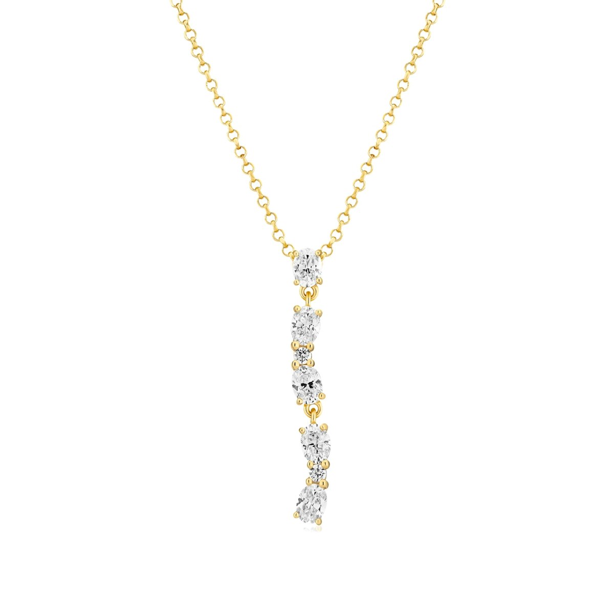 Hetzelfde ontwerp is ook verkrijgbaar in 18 karaats verguld 925 sterling zilver, wat de ketting een extra luxe en warme gloed geeft. Met zijn gepolijste oppervlak en handgezette facetgeslepen witte zirkonia is deze ketting een ideale keuze, of je nu een geraffineerde touch wilt toevoegen aan je dagelijkse garderobe of een mooi detail voor een speciale gebeurtenis.