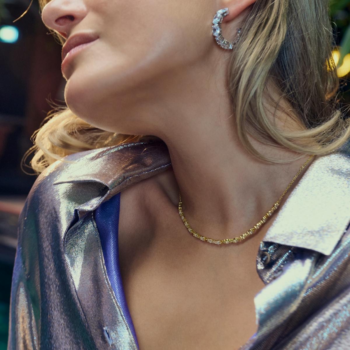 Ontdek de stijlvolle ketting gemaakt van 18 karaats verguld 925 sterling zilver met een glanzend oppervlak en bezet met facetgeslepen witte zirkonia. Deze ketting is de perfecte combinatie van klassieke elegantie en modern design en is ideaal voor zowel alledaagse als feestelijke gelegenheden.