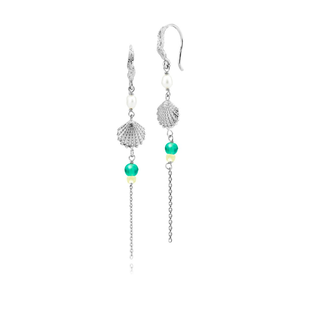 Marina Seashell øreringe er udsmykket med en ferskvandsperle, der hænger i forlængelse af en muslingeskal, beige seedpearl og en røgkvarts med en kæde i enden. Disse elegante øreringe er alsidige og velegnede til både festlige lejligheder og dagligdagsbrug.